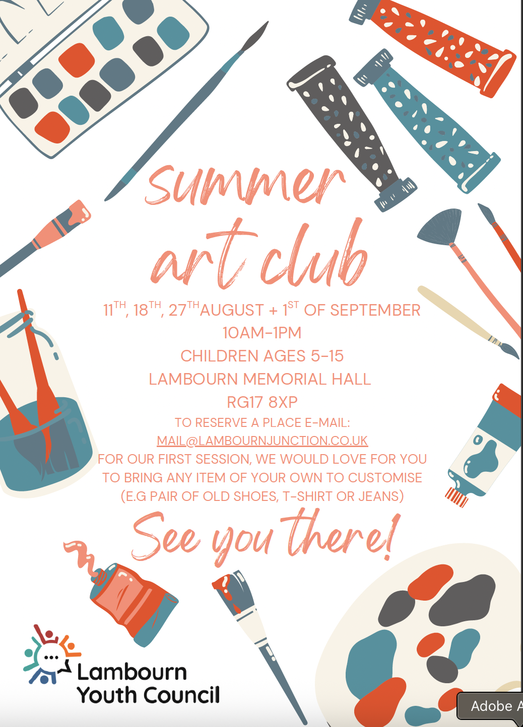 Summer Art Club in Lambourn August 7, 2025 - We are excited to announce the Summer Art Club in Lambourn, a creative initiative organised by the Lambourn Youth Council. Open to children aged 5 to 15, the club offers a chance to explore art in a relaxed and supportive setting. Sessions will take place on 11 August, 18 August,… Continue Reading